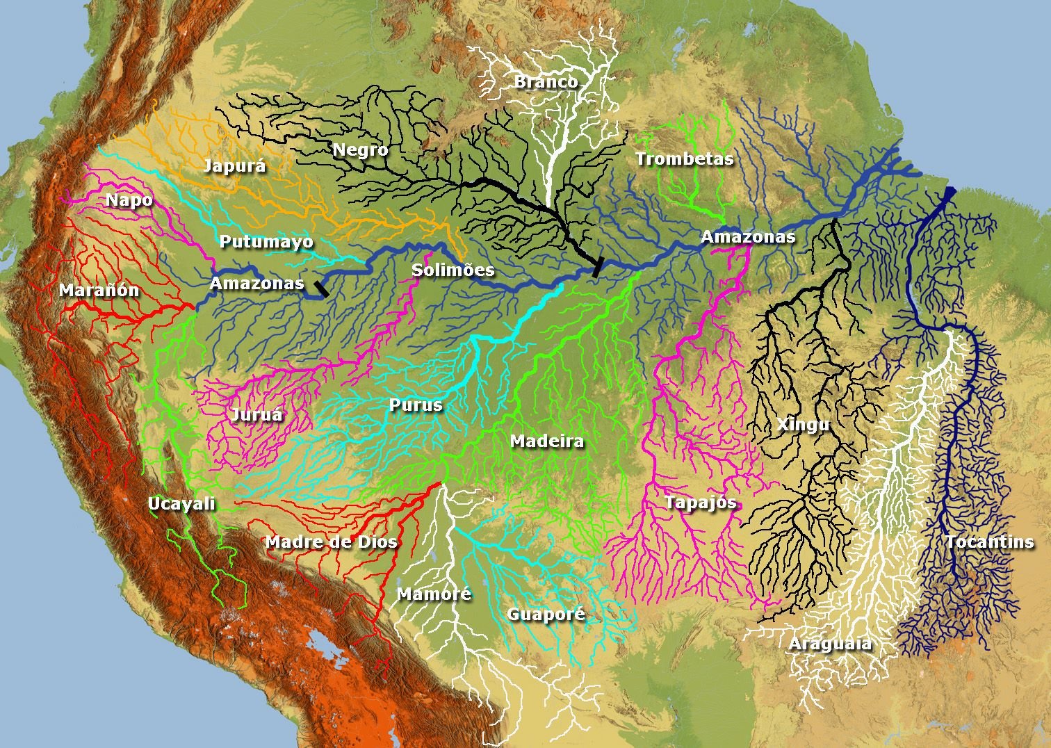 Слід відзначити одну з дивовижних рис Амазонки: у світі немає другої великої річки з такою великою кількістю кольорових вод. Вода р. Негру дуже темна, а р. Бранко — біла, як молоко; є потоки з жовтим, сірим, зеленуватим, червонуватим забарвленням.